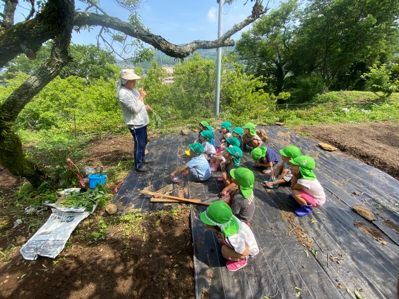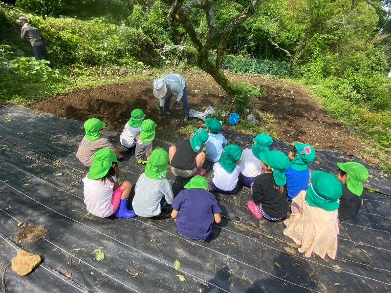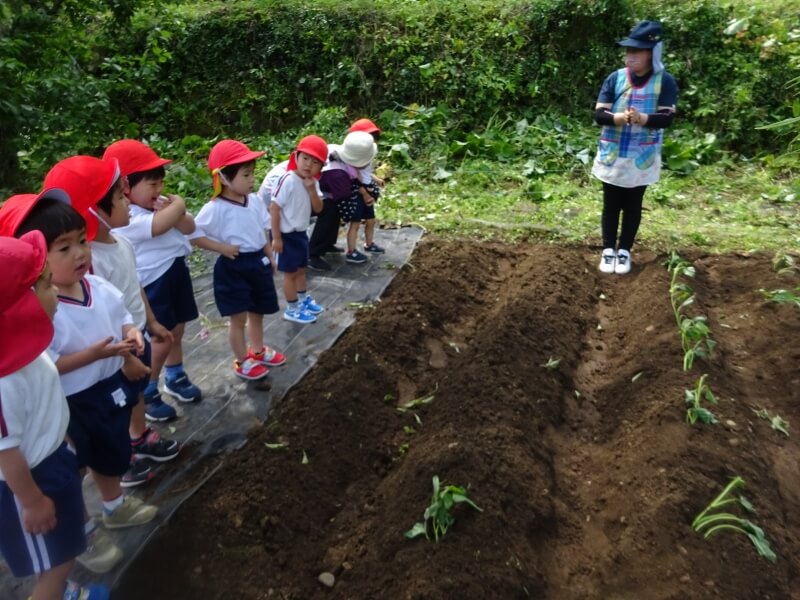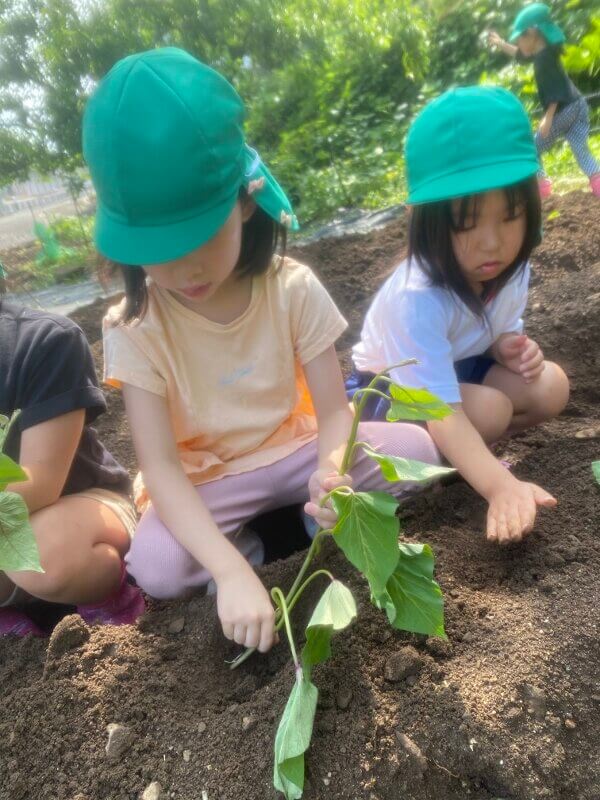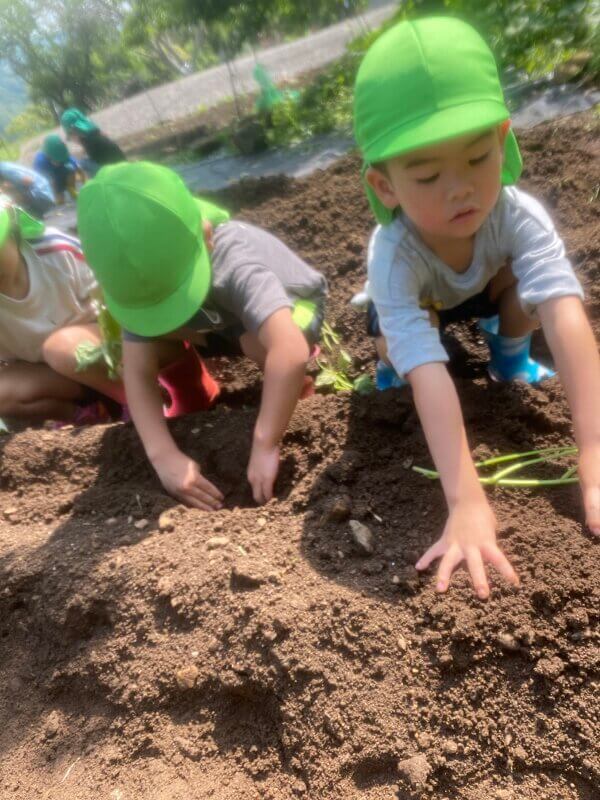 「芋の苗は寝かせてあげるんだよ」と園長先生に教わり、苗をそーっと