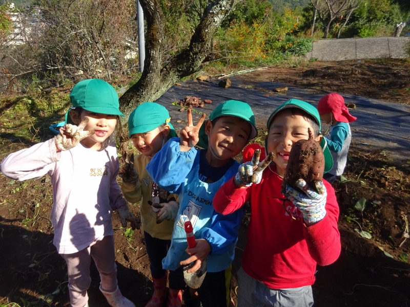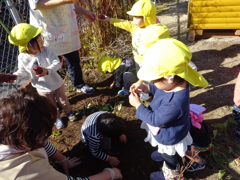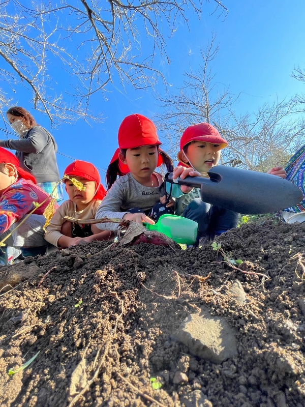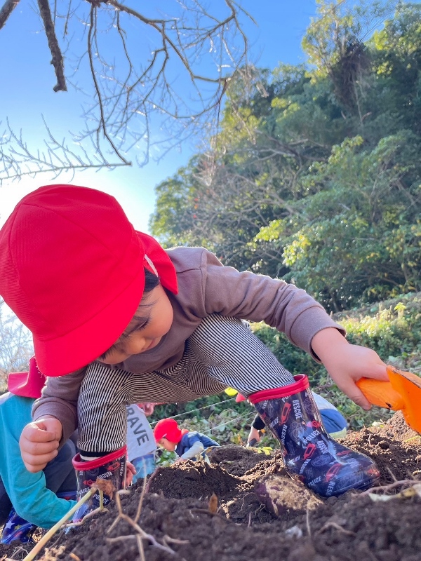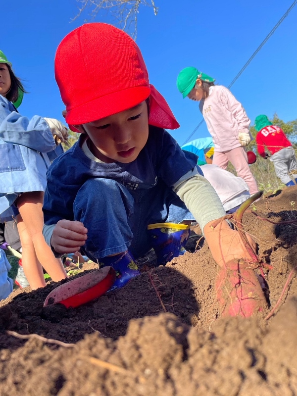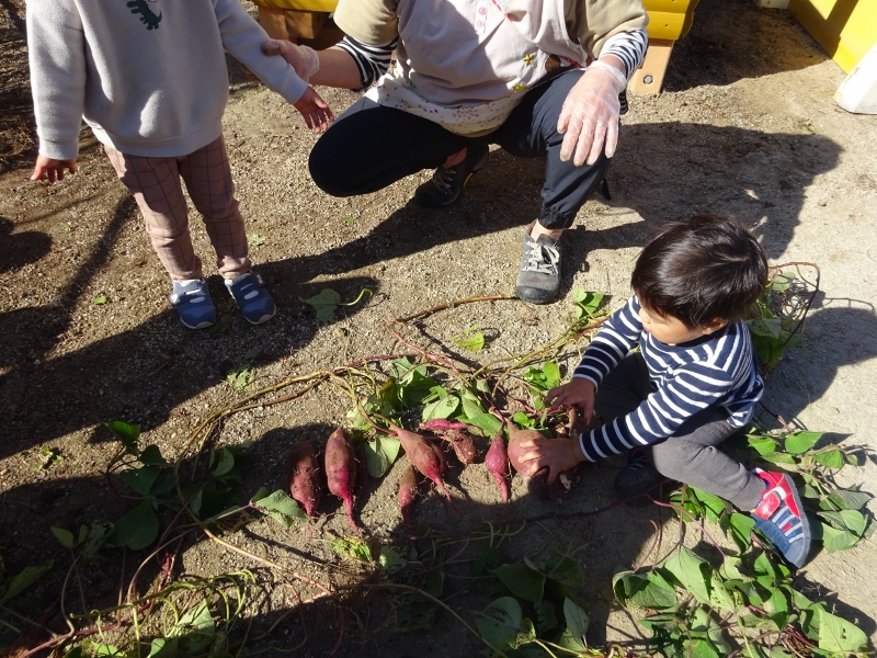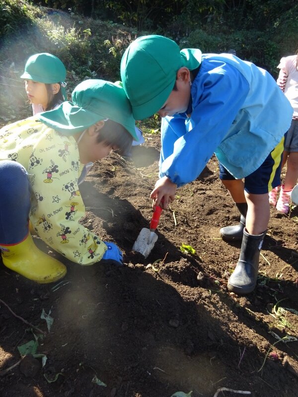 大自然の中、愛光保育園の畑で芋ほりをしました。土の感触が楽し