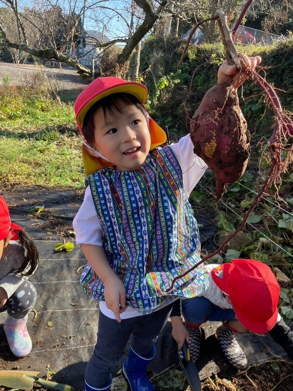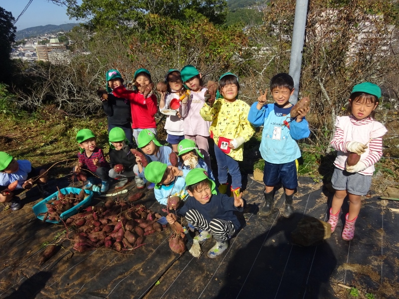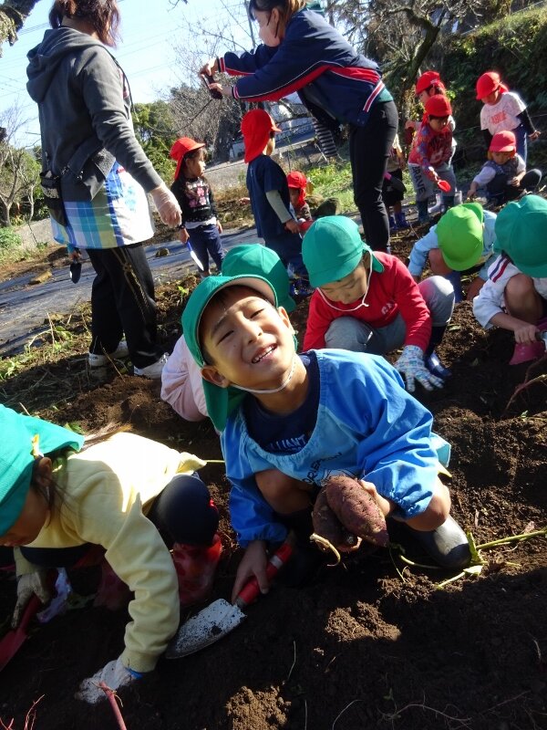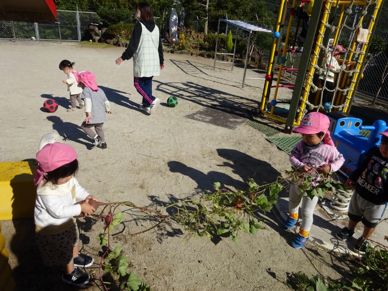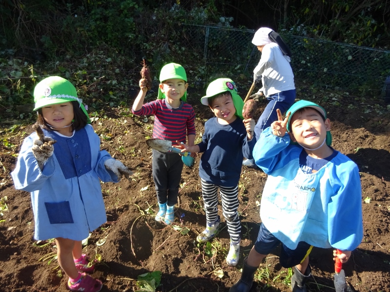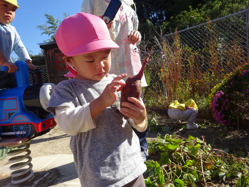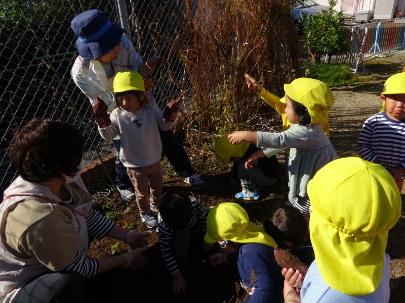 大自然の中、愛光保育園の畑で芋ほりをしました。土の感触が楽し