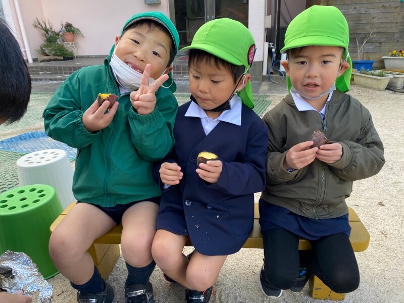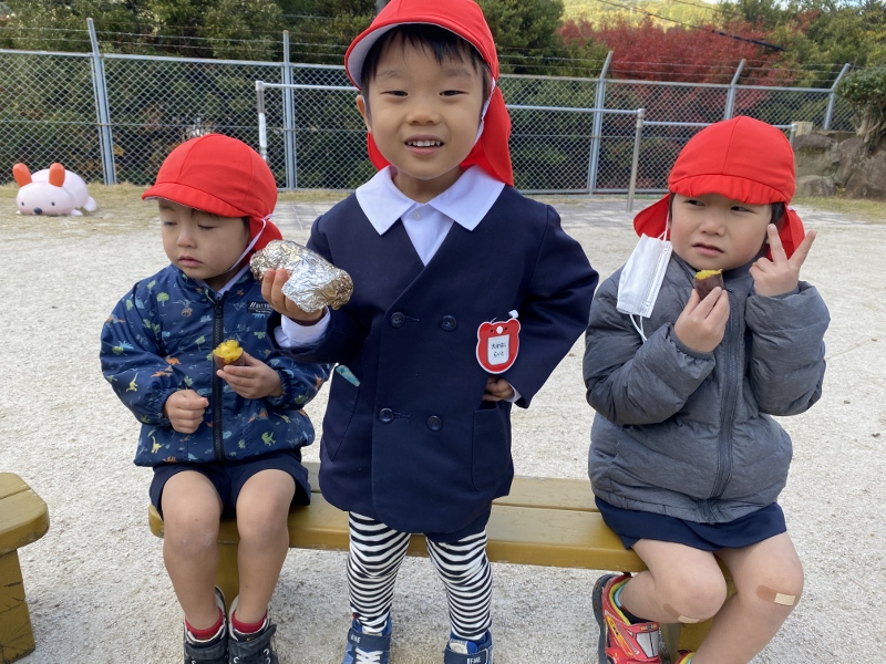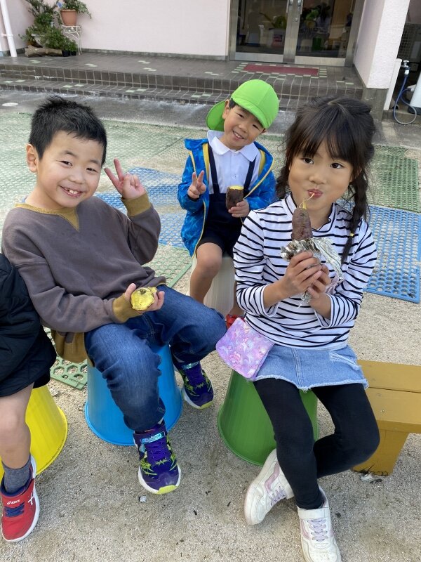ルを巻いて準備OK!!園長先生が外で火を起こし、焼き芋にしてくれま