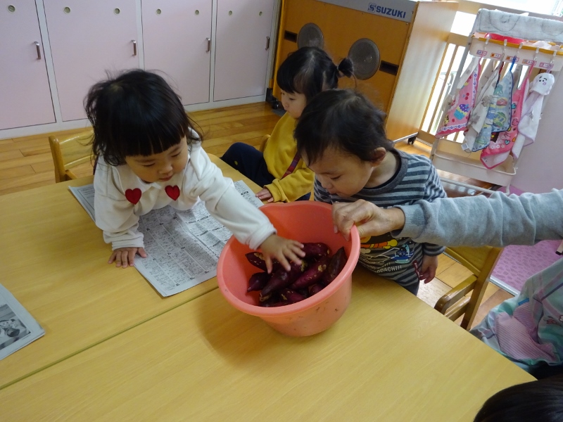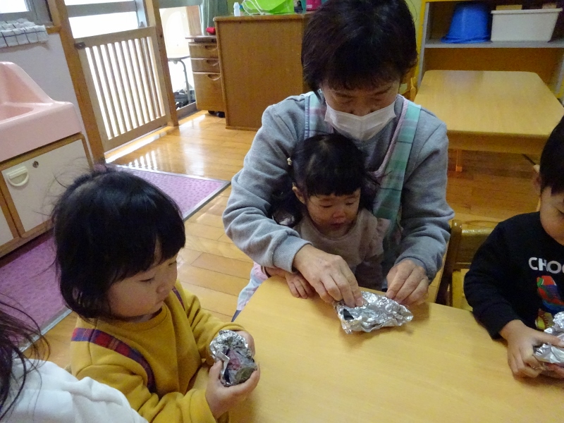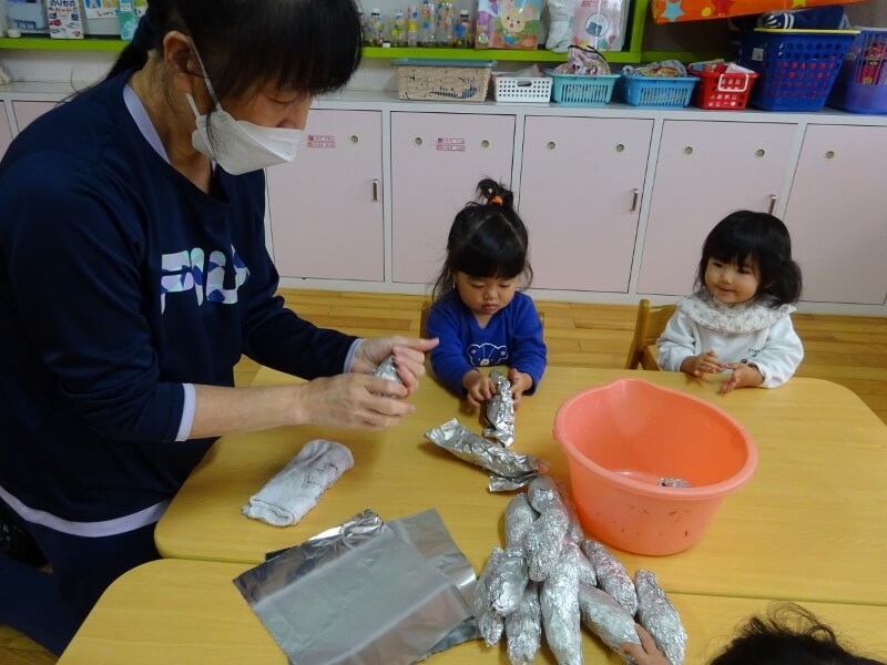 をすることに。自分たちで新聞紙を濡らしお芋を巻きまき、アルミホイ